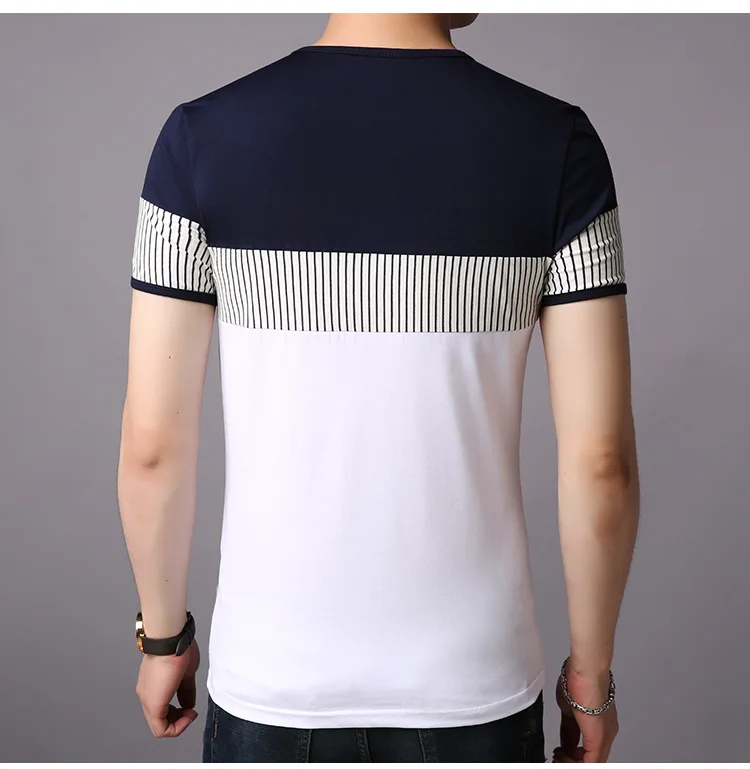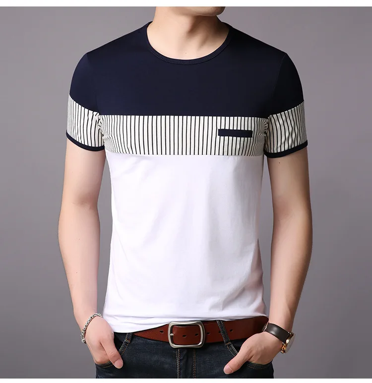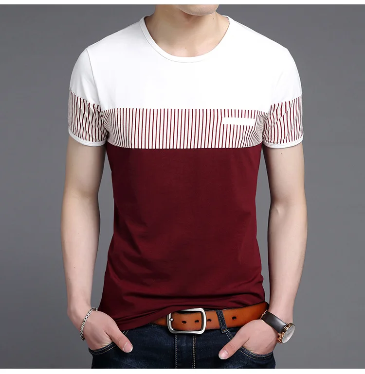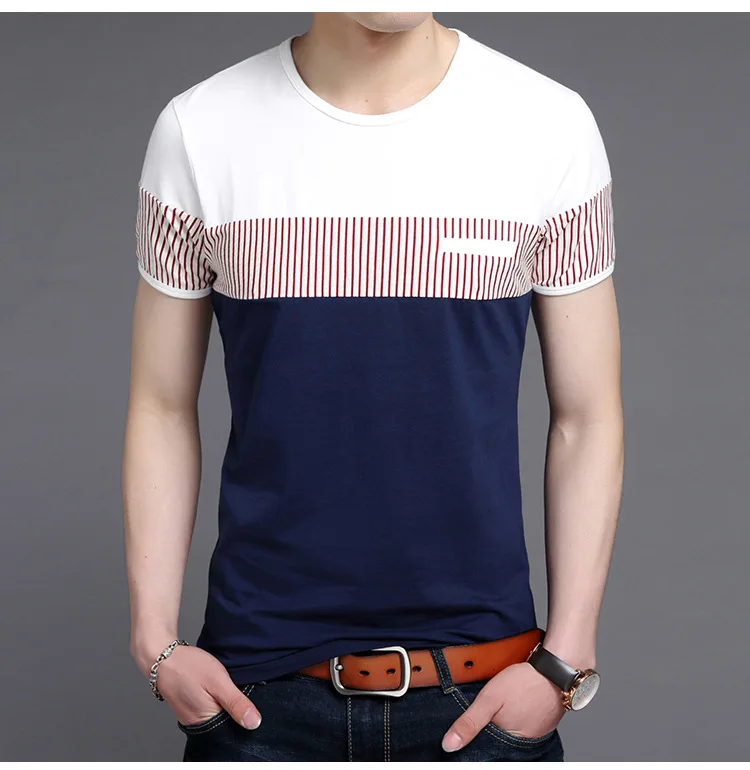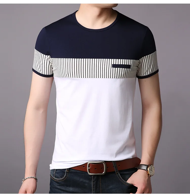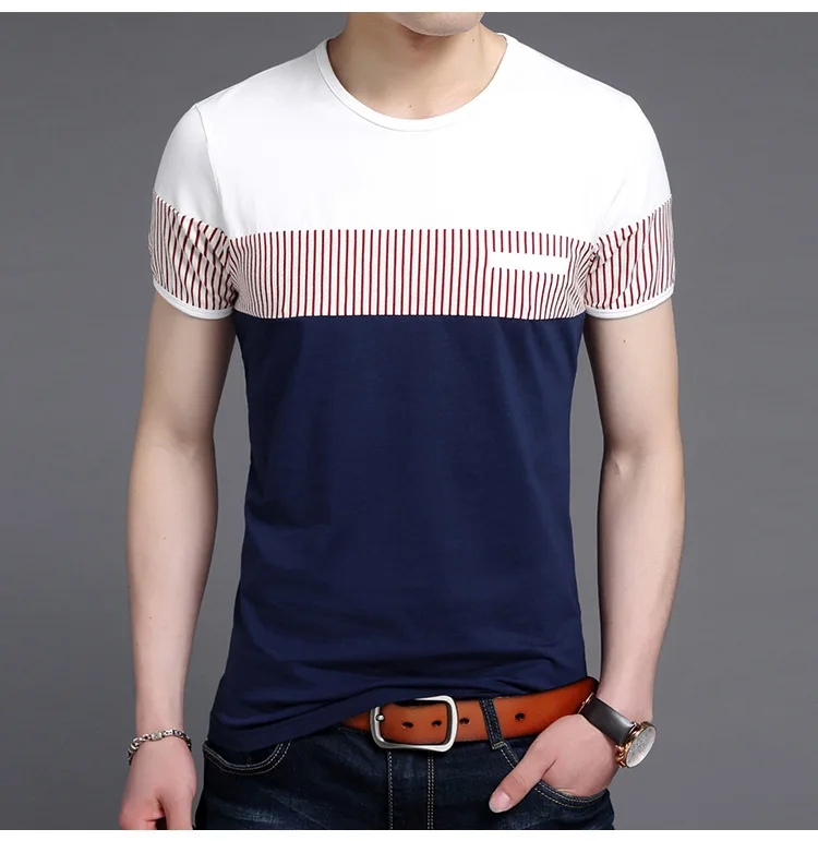 New Summer Stripe T Shirt Men Cotton Short Sleeve O Neck Casual Tshirts Mens Fashion Slim Fit Patchwork Tops Tees Men Clothing