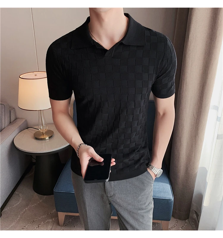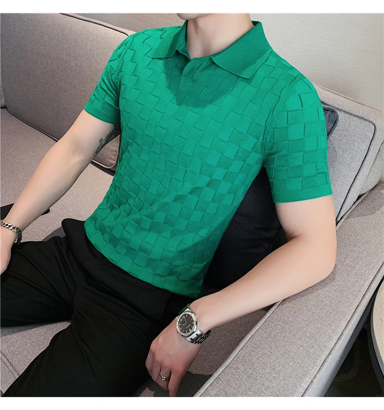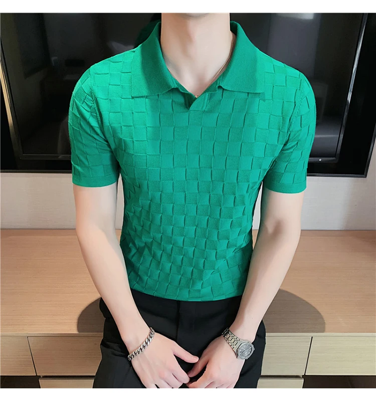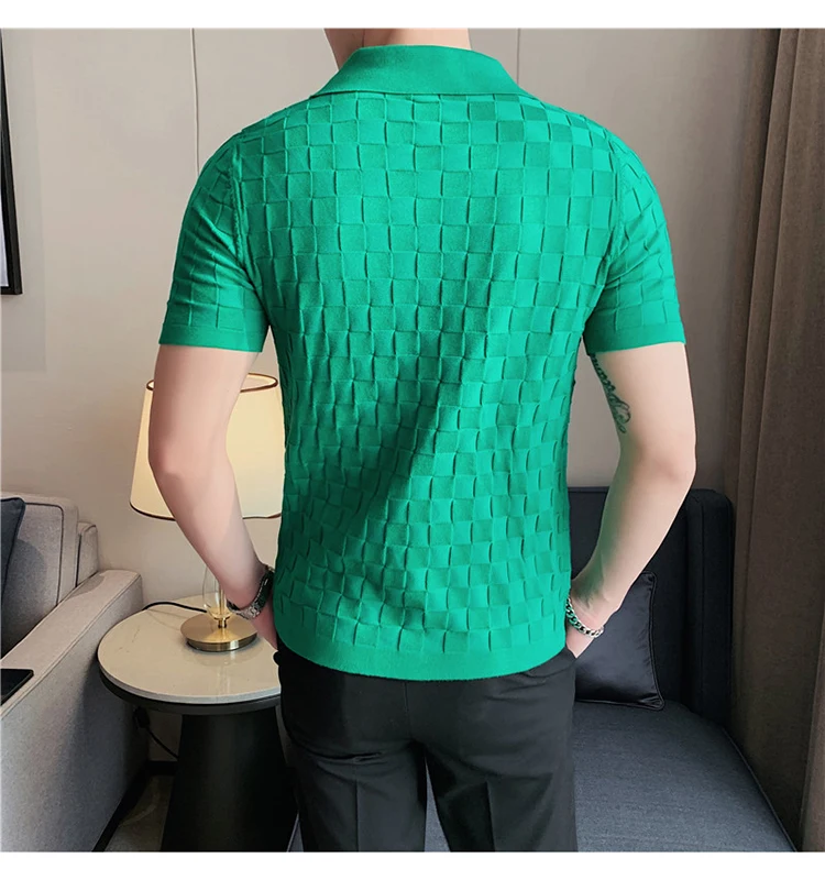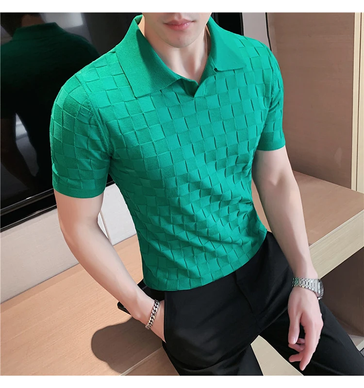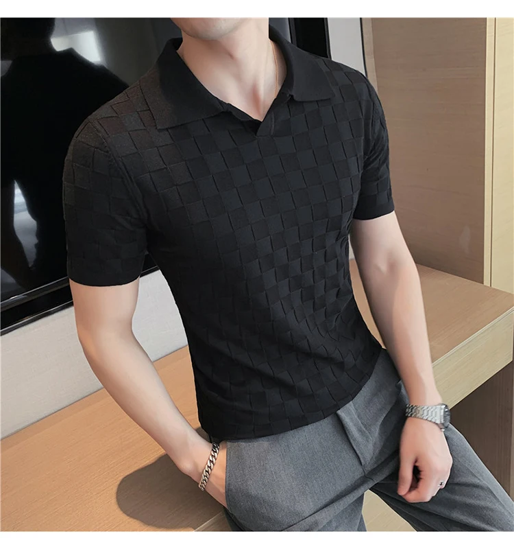 Black/Gray/Green Summer Fashion Sexy Plaid Polo Shirts For Men Clothing 2022 Stretched Slim Fit Casual Short Sleeve Polo Homme