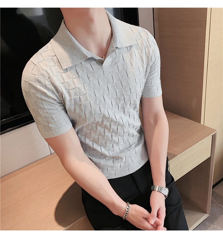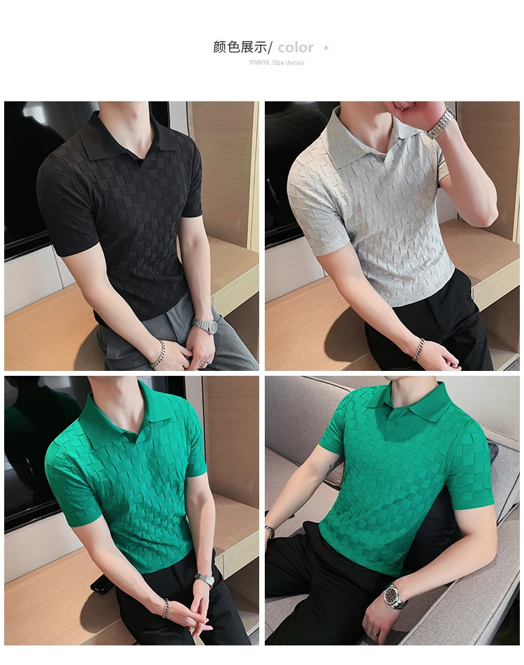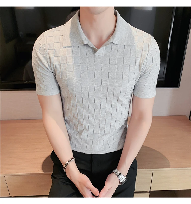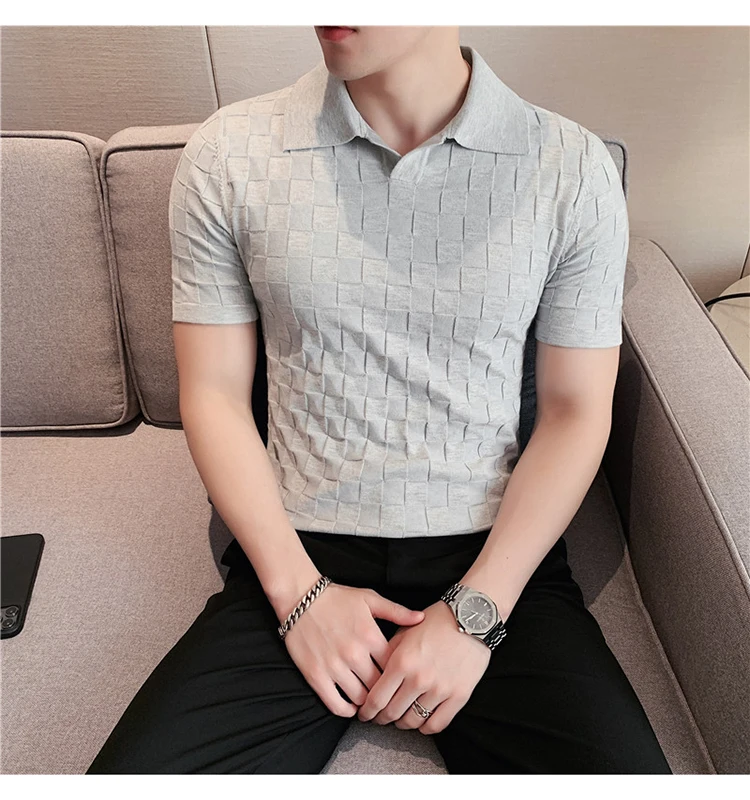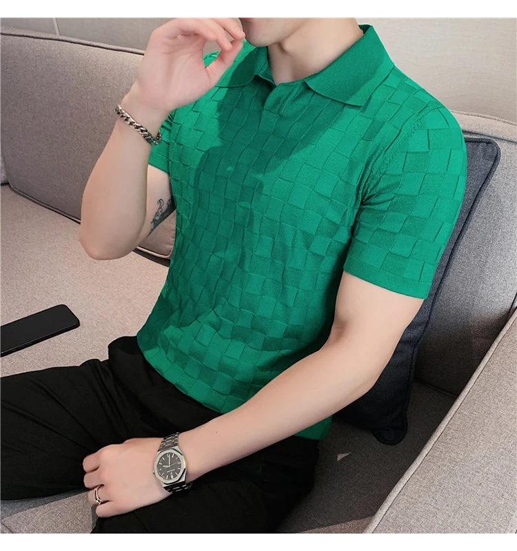 Black/Gray/Green Summer Fashion Sexy Plaid Polo Shirts For Men Clothing 2022 Stretched Slim Fit Casual Short Sleeve Polo Homme